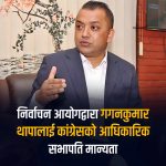 निर्वाचन आयोगले गगनकुमार थापालाई नेपाली कांग्रेसको आधिकारिक सभापतिको रूपमा मान्यता दिएको छ। राजनीतिक दलसम्बन्धी ऐन, २०७३ को दफा ५१ अनुसार पार्टीको विवरण अद्यावधिक गर्दै आयोगले थापा नेतृत्वको कार्यसमितिलाई वैधानिक ठहर गरेको हो। आयोगको यो निर्णयसँगै लामो समयदेखि चल्दै आएको..
