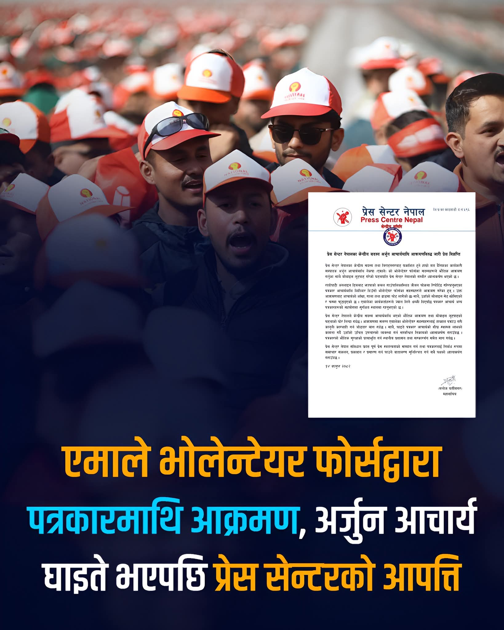 प्रेस सेन्टर नेपालका केन्द्रीय सदस्य तथा विराटनगरबाट प्रकाशित हुने हाम्रो मत दैनिकका कार्यकारी सम्पादक अर्जुन आचार्यमाथि भएको भौतिक आक्रमणप्रति प्रेस सेन्टर नेपालले गम्भीर ध्यानाकर्षण भएको जनाएको छ। नेकपा (एमाले) निकट भोलेन्टेयर फोर्सका सदस्यहरूले आचार्यमाथि कुटपिट गर्नुका साथै..