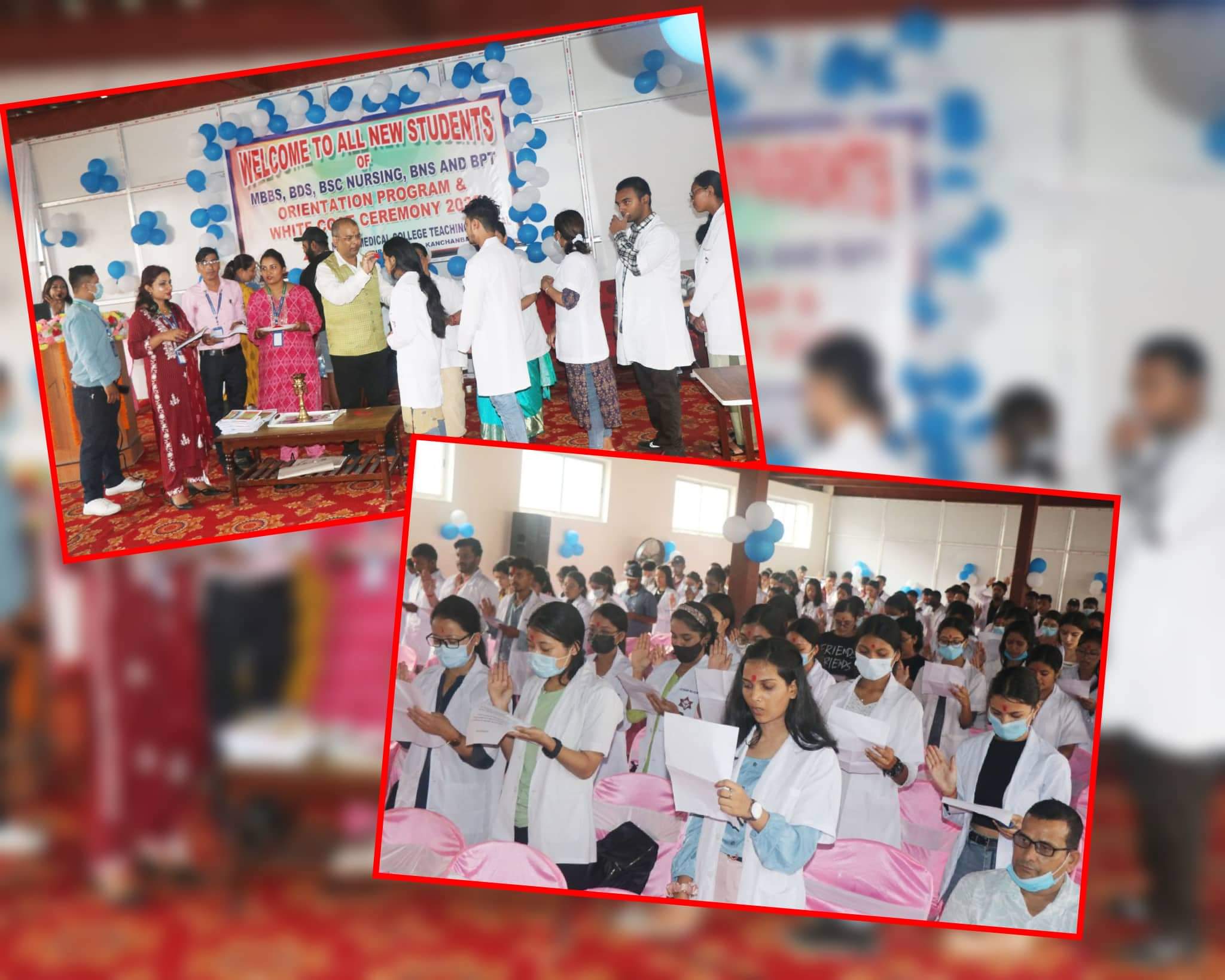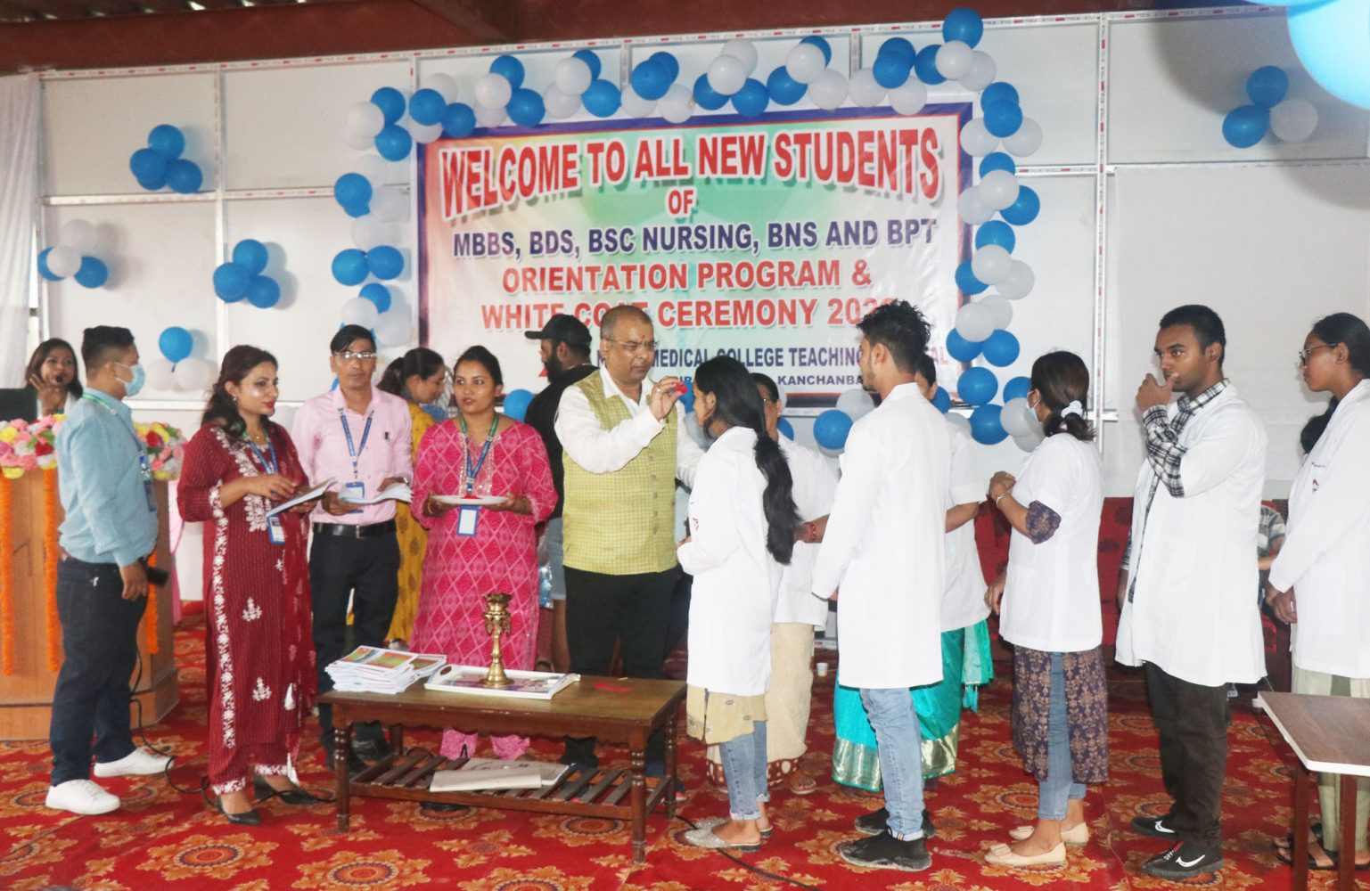 कार्यक्रममा नोबेल मेडिकल कलेजका प्राचार्य प्रा.डा.रामहरी घिमिरे, सहायक प्राचार्य प्रा.डा.रितु शर्मा बराल, अन्तर्राष्ट्रिय शैक्षिक निर्देशक डा.निरञ्जन कुमार, जेनेरल मेनेजर रुद्र प्रसाद शर्मा लगायतले विद्यार्थीहरुलाई अविर लगाएर कलेजमा स्वागत गरे । सो अवसरमा ‘ह्वाइट कोट सेरमोनी’ पनि गरियो । कलेजको तर्फबाट सबै नयाँ विद्यार्थीहरुलाई सेतो कोर्ट पहिराइयो । कलेजको नियम र पालना गर्नुपर्ने अनुशासनको बिषयमा कार्यक्रममा विद्यार्थीहरुलाई जानकारी पनि गराइएको थियो ।