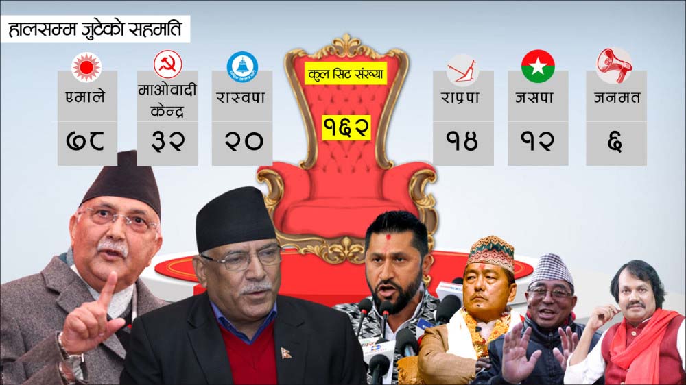 बैठकमा सहभागी माओवादी नेता वर्षमान पुनका अनुसार दाहाललाई प्रधानमन्त्रीमा अघि सार्दै राष्ट्रपतिसमक्ष आइतबारै दाबी पेश गर्ने सहमति छ । दाहाललाई एमालेका ७८, माओवादीका ३२, राष्ट्रिय स्वतन्त्र पार्टीका २०, राप्रपाका १४, जसपा १२ र अन्य साना दलको समेत समर्थन जुटेको बताइएको छ । सिके राउत नेतृत्वको जनमत पार्टीले पनि नयाँ गठबन्धनलाई सघाउने छ । जनमत पार्टीका महासचिव चन्दन सिंहले सरकार बनाउने प्रक्रियामा आफूहरुले समर्थन गर्ने बताए । जनमत पार्टीका ६ जना सांसद छन् ।