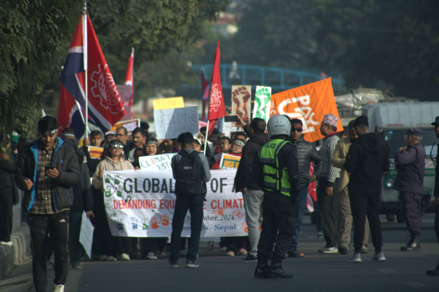 काठमाडौं,१ मंसिर ।नेपालमा सक्रिय जलवायु अभियन्ताहरू सडकमा उत्रिएका छन्। नागरिक समाज,पिछडिएको वर्ग,अपांगता भएका व्यक्ति, साना किसान, आदिवासी समूह र स्थानीय समुदायहरूको ठूलो संख्याले शनिबार सडकमा प्रदर्शन गरेको हो।