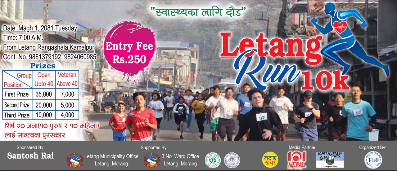 लेटाङ, १० मंसिर । लेटाङ रंगशालामा २०८१ साल माघ १ गतेदेखि सुरु हुने लेटाङ रन 10k प्रतियोगिताका पुरस्कार तथा अन्य विवरण आयोजक कमलपुर टोल विकास संस्थाले सार्वजनिक गरेको छ।