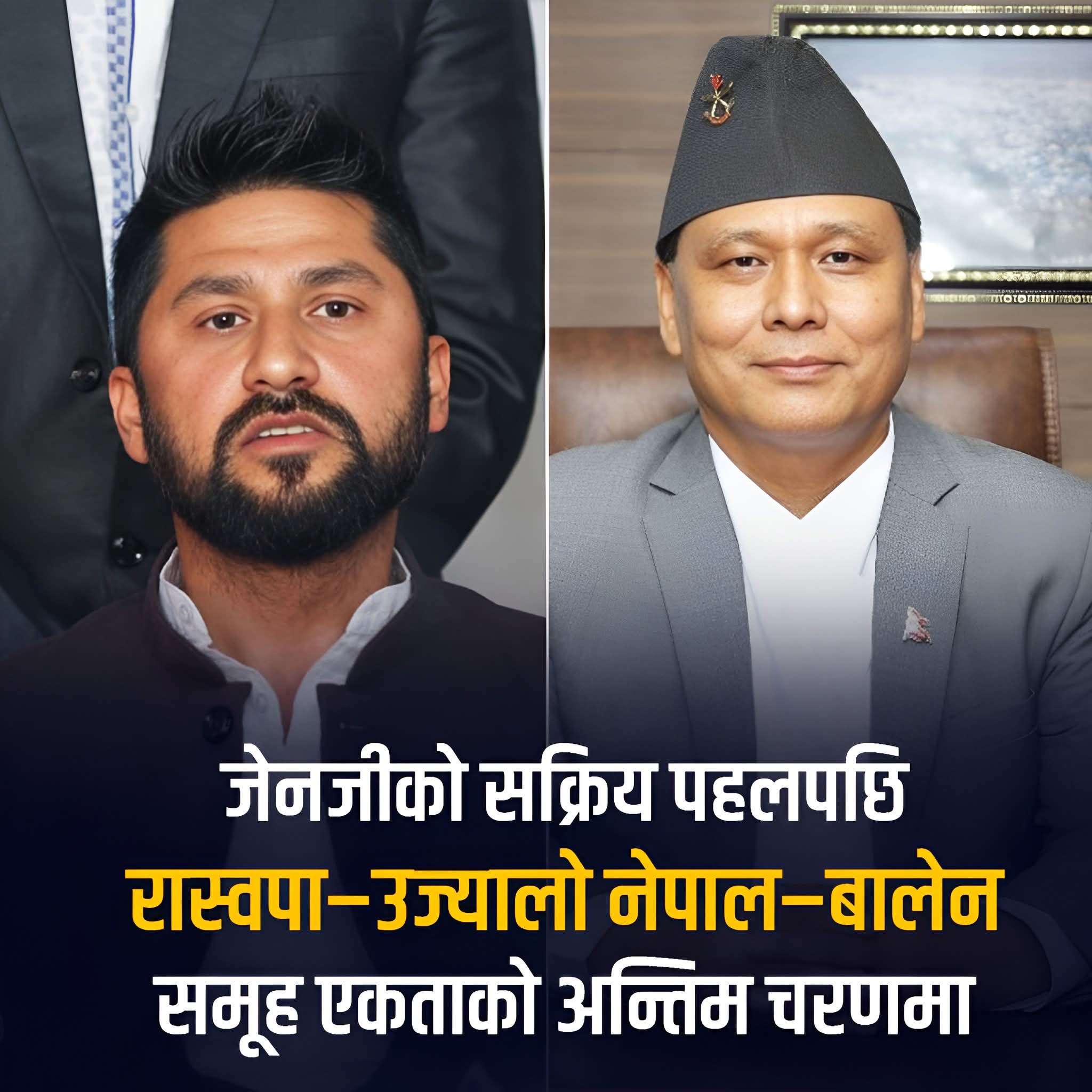 रास्वपा–उज्यालो नेपाल–बालेन समूहबीच वार्ता पूरा गर्न स्वर्णिम वाग्ले, डीपी अर्याल, शिशिर खनाललगायत नेताहरू सक्रिय छन्। बागमती प्रदेश महामन्त्री सुरेन्द्र भट्टका अनुसार, “सबै पक्ष अहिले धेरै सकारात्मक छन्। पुराना दलहरू फेरि हाबी नहोउन् भन्ने चिन्ताले एकता सम्भावना बढेको हो।”