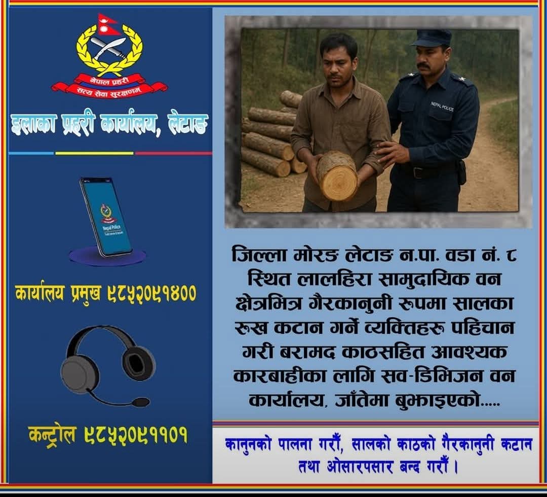 जाँते, २९ मंसिर ।मोरङको लेटाङ नगरपालिका वडा नं. ८ जाँते लालझोडामा रहेको लालहिरा सामुदायिक वनमा गैरकानुनी रूपमा सालको रुख काट्ने व्यक्तिहरूलाई पहिचान गरी काठसहित नियन्त्रणमा लिइएको छ।