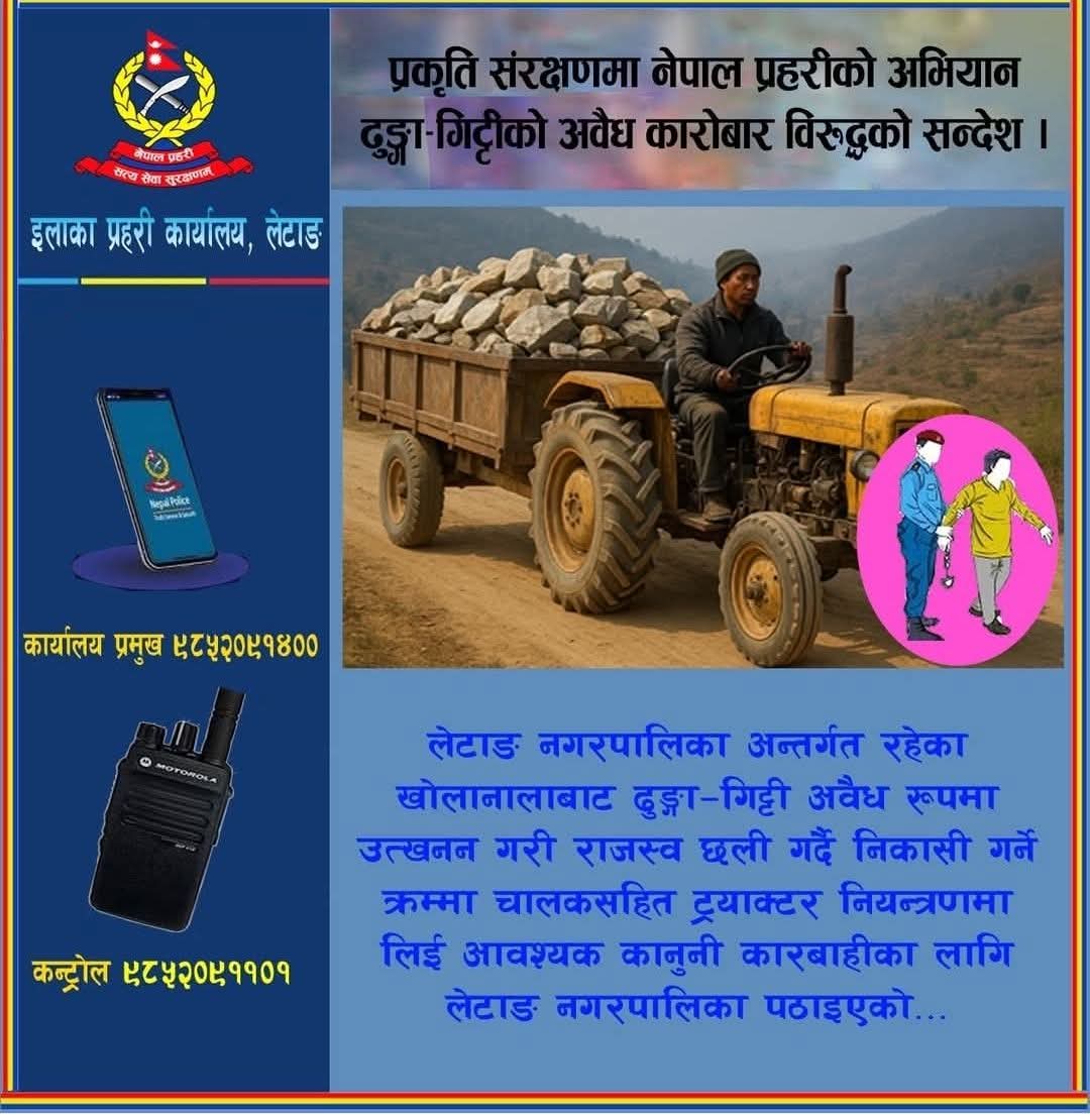 लेटाङ १ पुस । लेटाङ नगरपालिका भित्र अबैध रूपमा ढुङ्गा–गिट्टी ओसारपसार गर्दै आएको अवस्थामा ट्याक्टरसहित चालकलाई प्रहरीले नियन्त्रणमा लिएको छ। ईलाका प्रहरी कार्यालय लेटाङको टोलीले मंसिर २९ गते नियमित गस्ती तथा निगरानीका क्रममा प्रा ०१–०२–००३ त ११८९ नम्बरको ट्याक्टर अबैध रूपमा ढुङ्गा–गिट्टी ढुवानी गरिरहेको अवस्थामा फेला पारी नियन्त्रणमा लिएको हो।