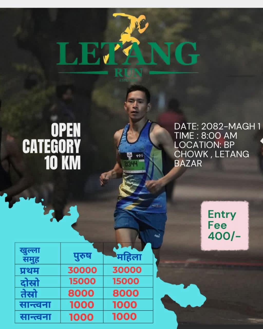 लेटाङ रन तेस्रो संस्करण माघ १ गते, खुल्ला तर्फ महिलापुरुषलाई ३०/३० हजार पुरस्कार