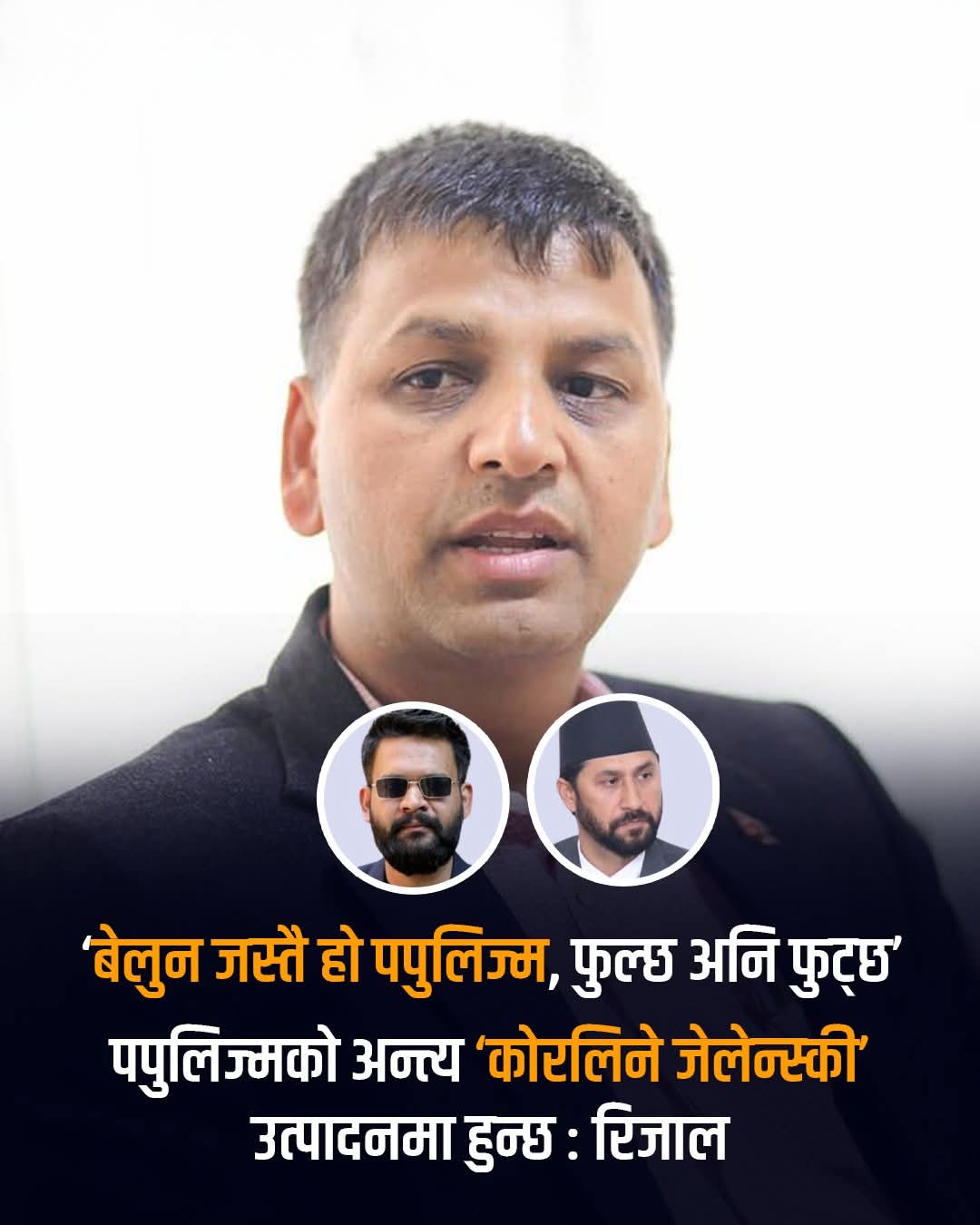 उनले लोकप्रियतावादी प्रवृत्तिको अन्तिम परिणामका रूपमा ‘कोरलिने जेलेन्स्कीहरू’ जन्मिन सक्ने चेतावनी पनि दिएका छन्। रिजालका अनुसार यस्तो राजनीतिले देश र समाजलाई दीर्घकालीन संकटतर्फ धकेल्न सक्छ, जहाँ नेतृत्व भावनामा बग्ने तर संस्थागत स्थायित्व कमजोर हुने जोखिम रहन्छ।