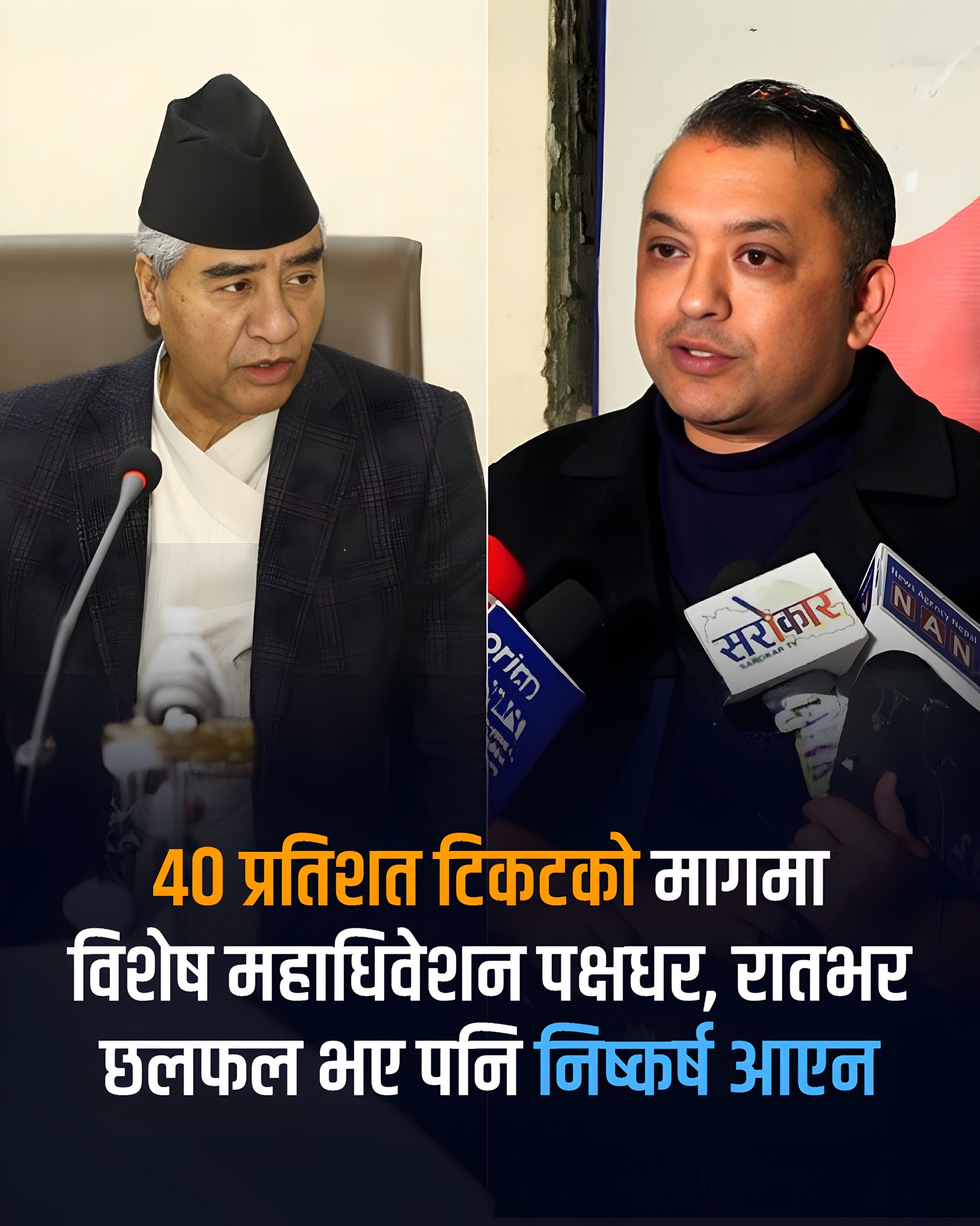 विशेष महाधिवेशन पक्षधरहरूले आसन्न प्रतिनिधिसभा निर्वाचनमा आफ्नो समूहको सम्मानजनक र न्यायोचित प्रतिनिधित्व सुनिश्चित गर्नुपर्ने माग राखेका छन् । उनीहरूले संसदीय बोर्ड र प्रत्यक्ष निर्वाचनमा कम्तीमा ४० प्रतिशत टिकट विशेष महाधिवेशन पक्षधरलाई दिनुपर्ने अडान लिएका छन् । वार्तामा सहभागी एक नेताका अनुसार, “सम्मानजनक प्रतिनिधित्व भनेको कम्तीमा ४० प्रतिशत टिकट सुनिश्चित हुनु हो भन्नेमा कुरा आएको छ ।”