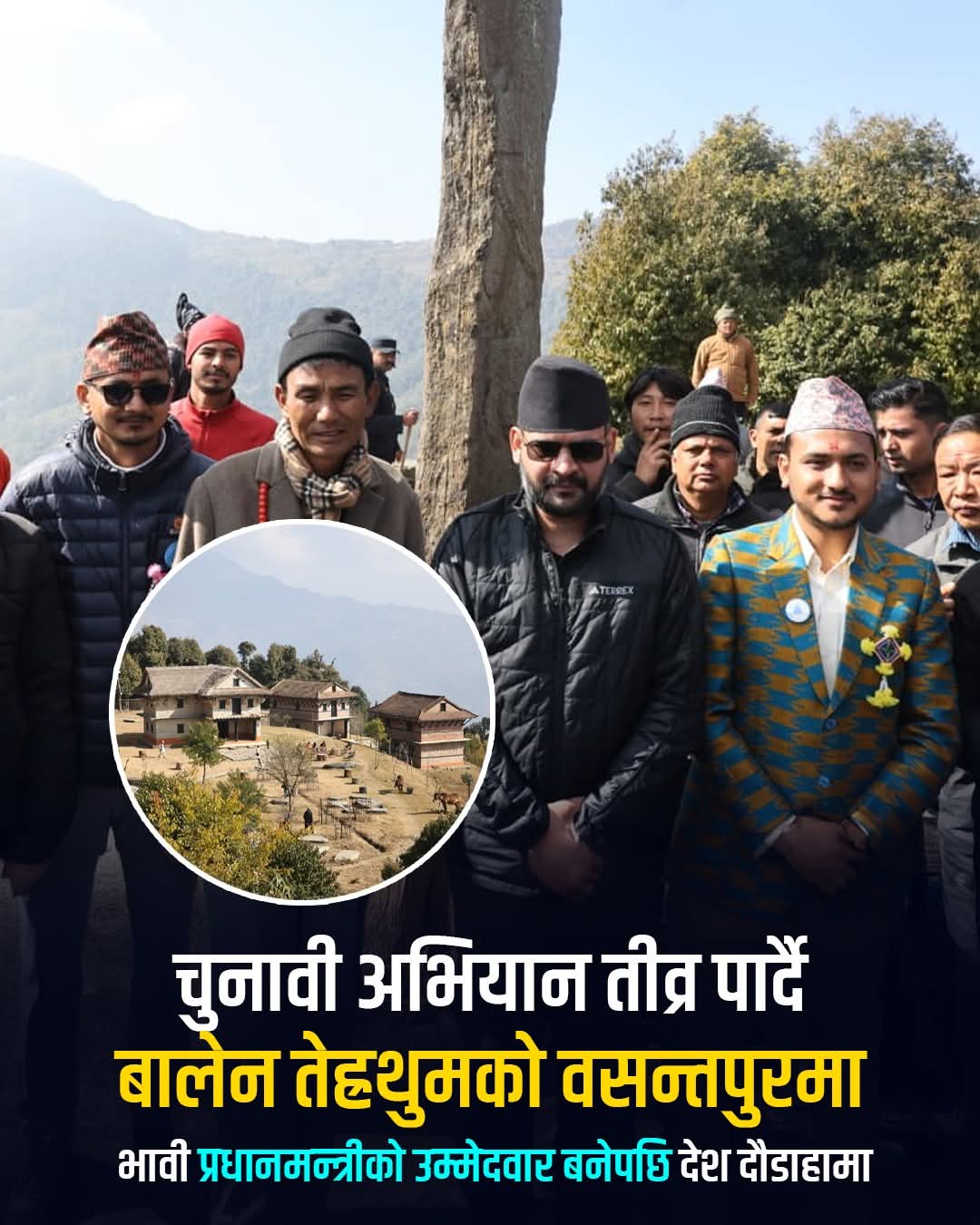 राष्ट्रिय स्वतन्त्र पार्टी (रास्वपा) का वरिष्ठ नेता बालेन्द्र शाह चुनावी अभियानका क्रममा तेह्रथुम पुगेका छन्। झापा क्षेत्र नम्बर–५ बाट प्रतिनिधिसभा सदस्यका उम्मेदवार रहेका शाह इलाम, पाँचथर र ताप्लेजुङ हुँदै आज तेह्रथुमको वसन्तपुर आइपुगेका हुन्।