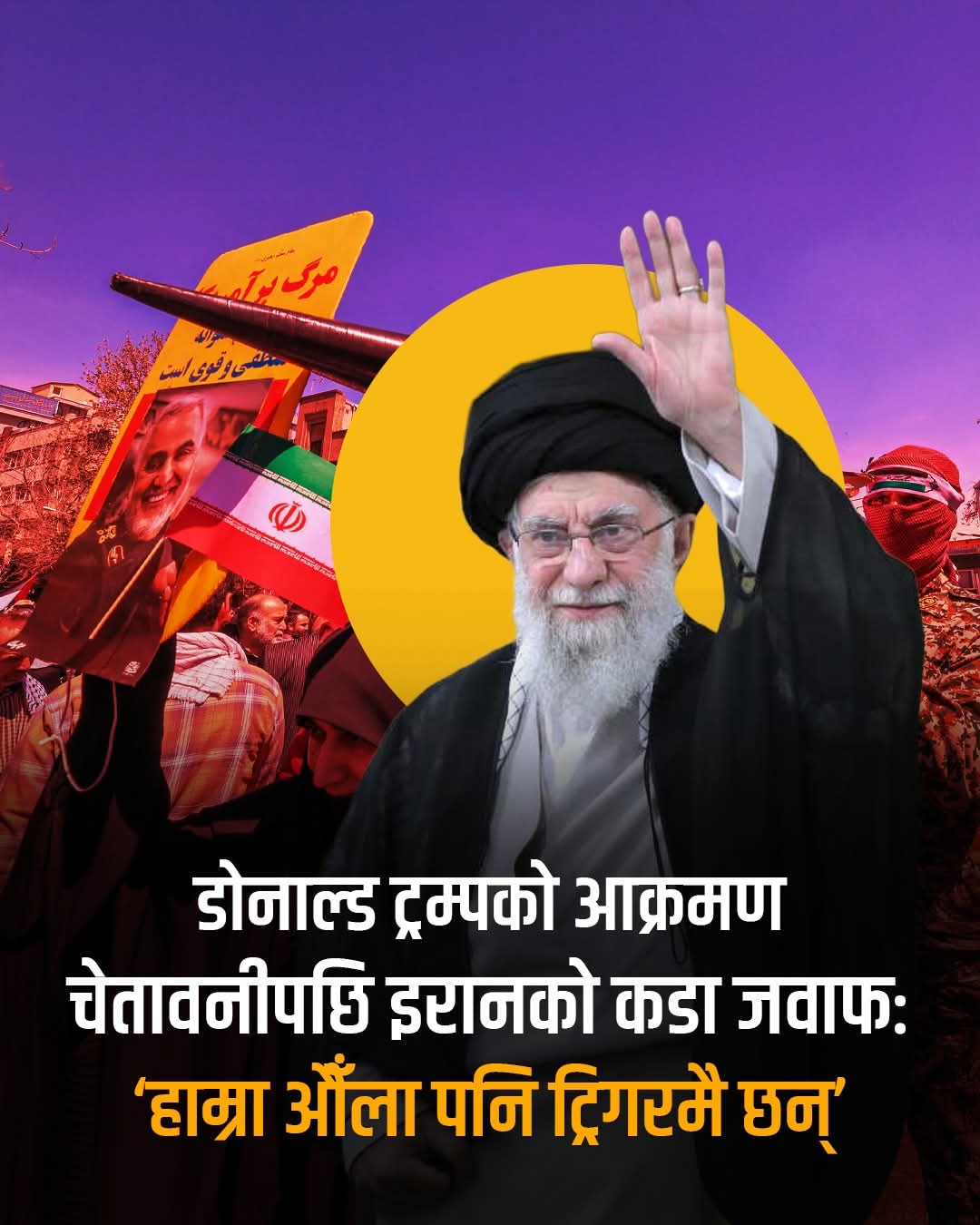 काठमान्डौ, १७ माघ। अमेरिकी राष्ट्रपति डोनाल्ड ट्रम्पले इरानलाई पुनः सैन्य कारबाहीको चेतावनी दिएका छन्। खाडी क्षेत्रमा अमेरिकाले आफ्नो सैन्य उपस्थिति बढाइरहेका बेला ट्रम्पले इरानले दुई सर्त पूरा नगरे सैन्य कारबाही हुन सक्ने संकेत गरेका हुन्। उनका अनुसार पहिलो सर्त इरानले कुनै पनि हालतमा परमाणु हतियार विकास गर्नु नहुने र दोस्रो सर्त देशभित्र भइरहेका प्रदर्शनकारीहरूको हत्या तुरुन्त रोक्नुपर्ने हो।