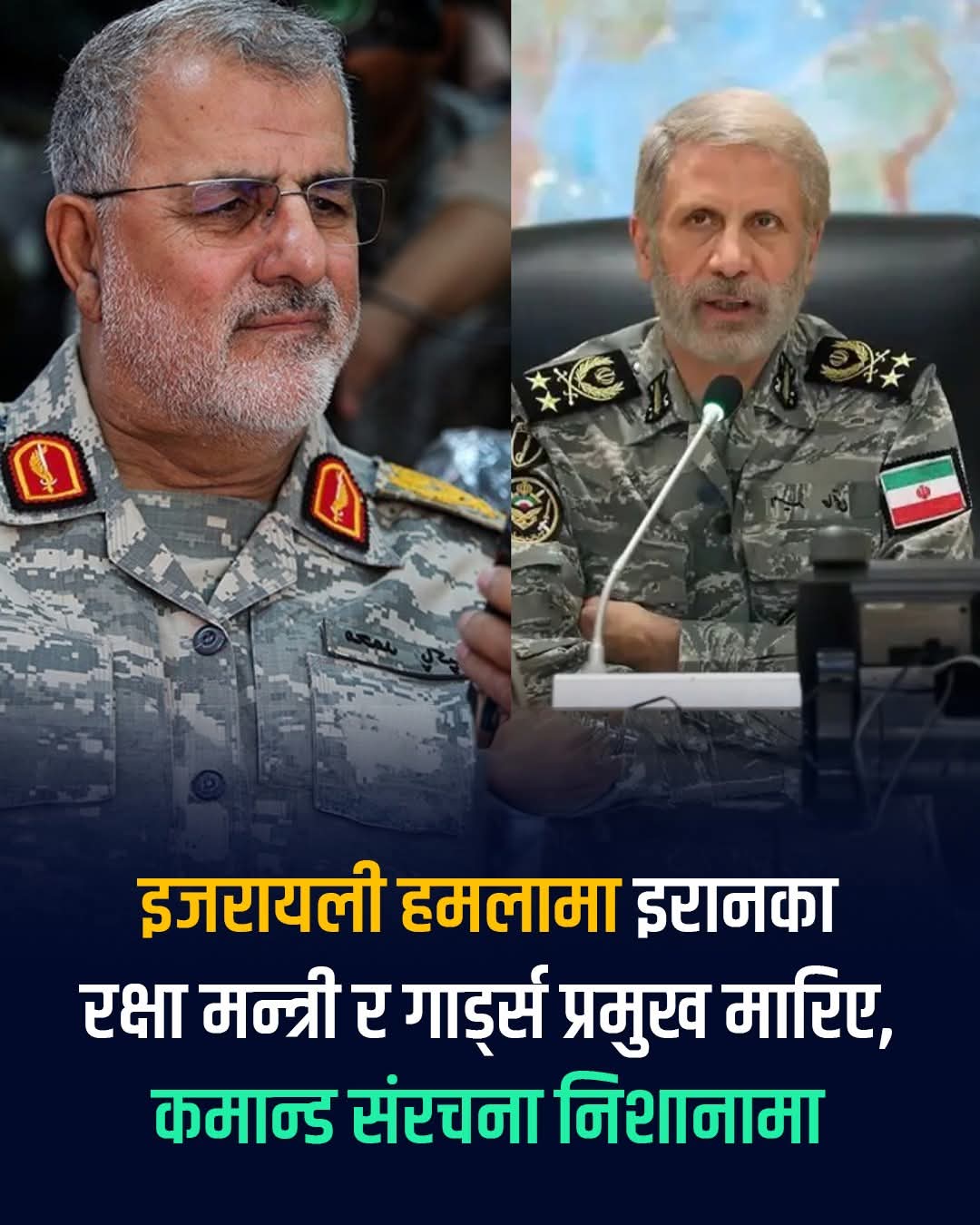 इरानका रक्षा मन्त्री आमिर नासिरजादेह र इस्लामिक रिभोलुसनरी गार्ड्स कोर्प्स (आईआरजीसी) का कमान्डर मोहम्मद पाकपुर इजरायलले शनिबार गरेको आक्रमणमा मारिएको आशंका गरिएको छ। सैन्य अपरेसन र क्षेत्रीय गुप्तचर स्रोतसँग परिचित तीन स्रोतले रोयटर्ससँग कुरा गर्दै यस्तो दाबी गरेका हुन्। यद्यपि इरानी अधिकारीहरूले हालसम्म यी दुई उच्च सैन्य पदाधिकारीको अवस्थाबारे औपचारिक पुष्टि गरेका छैनन्, जसका कारण अनिश्चितता कायम छ।