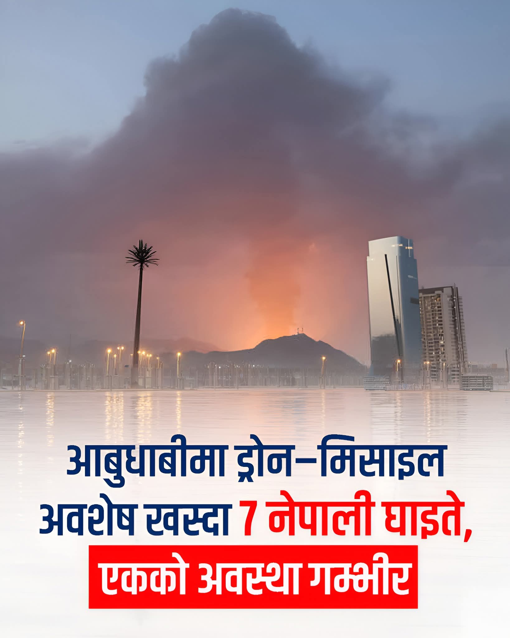 यूएई (संयुक्त अरब इमिरेट्स) को राजधानी अबुधाबीस्थित अज्बान क्षेत्रमा ड्रोन तथा मिसाइल अवरोधका क्रममा खसेका अवशेषका कारण ७ जना नेपाली नागरिक घाइते भएका छन्। घाइतेमध्ये एक जनाको अवस्था गम्भीर रहेको बताइएको छ।