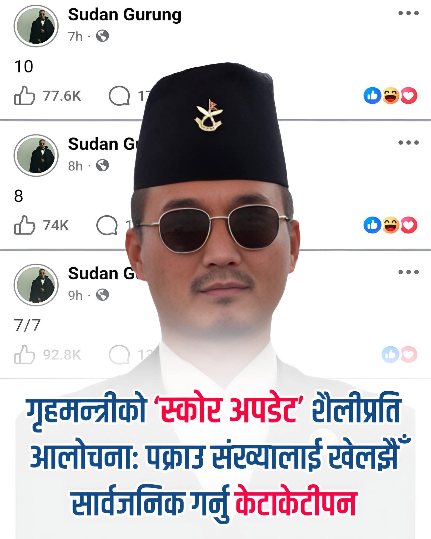 गृहमन्त्री सुदन गुरुङले सामाजिक सञ्जालमा पक्राउ परेका व्यक्तिहरूको संख्या ‘स्कोरबोर्ड’ जस्तो शैलीमा सार्वजनिक गरेपछि चौतर्फी आलोचना सुरु भएको छ। उनले आफ्नो फेसबुकमार्फत ‘७/७’, ‘८’, ‘१०’ जस्ता अंक पोस्ट गर्दै कति जना समातिए भन्ने अपडेट दिएका थिए, जसले धेरैलाई आश्चर्यचकित बनाएको छ।