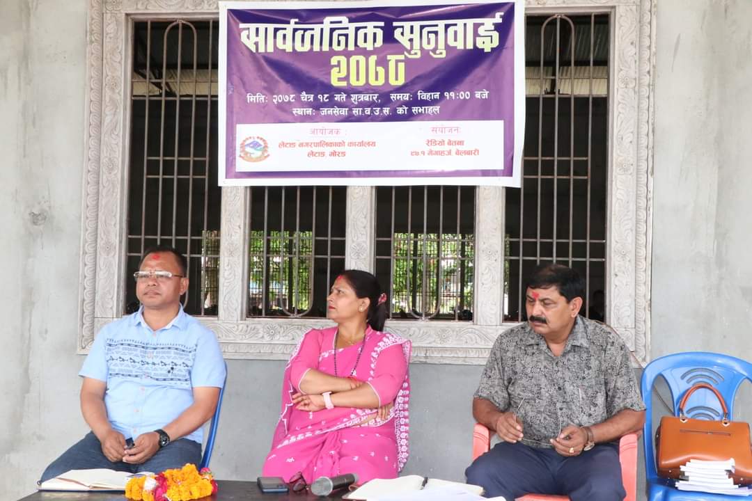 संस्थागत सुसासन कायम गर्ने तथा आफ्ना जनता प्रती उत्तरदायी हुने प्रकृयाको रुपमा सार्बजनिक सुनुवाई कार्यक्रम आयोजना गरिएको लेटाङ नगरपालिकाका प्रमुख प्रसासकिय अधिकृत अच्युत प्रसाद दाहालले बताउनुभयो ।