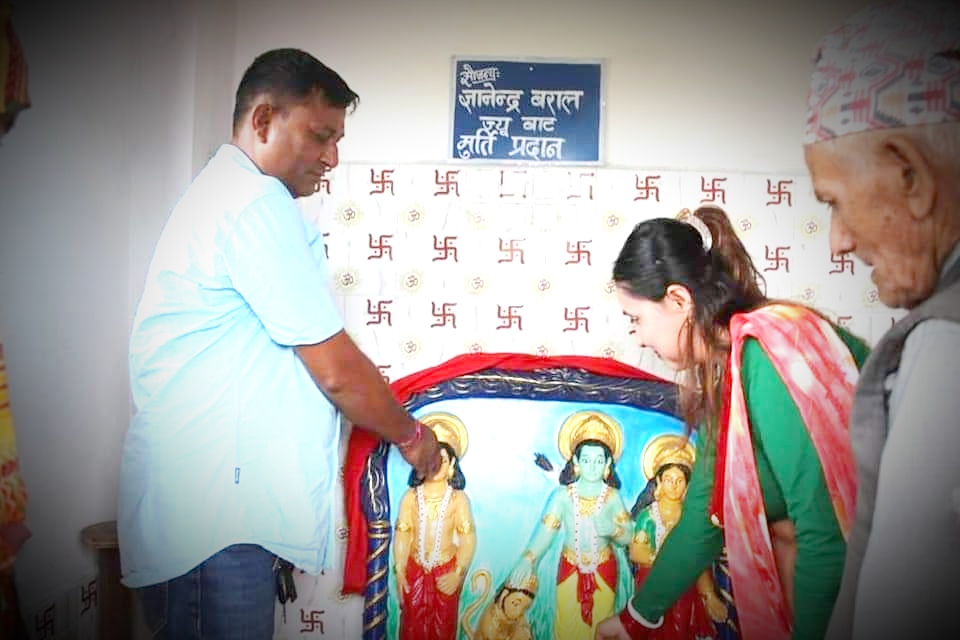 मधुमल्ला १ जेठ । मिक्लाजुङ गाउँपालिका वडा नं. ७ देविस्थान सिमसारमा रहेको रामजनकी मन्दिरमा राम जानकी प्रतिमा स्थापना गरिएको छ । मंगलबार रामजानकी मन्दिर परिसर मिक्लाजुङ ७ मा एक कार्यक्रमको आयोजना गरि राम जानकी मन्दिरको प्रतिमा स्थापना गरिएको राम जानकी मन्दिरका अध्यक्ष नर प्रसाद गिरिले बताए । मंगलबार बाजागाजा सहित राम जानकीको प्रतिमा लाई मधुमल्ला बजार परिक्रमा गराई मन्दिरमा प्रतिमा स्थापना गरिएको हो । राम जानकी मन्दिरमा प्रतीमा स्थापना गर्न मिक्लाजुङ वडा नं. ७ का समाजसेवी तथा युवा व्यवसायी ज्ञानेन्द्र बरालले सो राम जानकीको प्रतिमा निःशुल्क उपलब्ध गाराएका हुन । मन्दिरमा राम जानकीको प्रतिमा उपलब्ध गराउन पाउँदा खुसी लागेको ज्ञानेन्द्र बरालले बताए । लामो समय देखी राम जानकी मन्दिर बने पनी मन्दिर व्यवस्थापन समितिले राम जानकीको प्रतिमा स्थापना गर्न सकेको थिएन । सोही अभावलाई स्थानीय युवा व्यवसायी तथा समाजसेवी ज्ञानेन्द्र बरालले पुरा गरी दिएका हुन । बरालले ५७ हजार मुल्य बराबरको राम जानकीको प्रतिमा उपलब्ध गराएका थिए । मंगलबार एक कार्यक्रमका बिच यस्तै अन्य दताहरु देवी खानालले १६ हजार मुल्य बराबराको रङ, प्रकाश बस्नेतले ५ हजार मुल्य बराबरको टाइल, गोबीन्द भण्डारीले ८ हजार मुल्य बराबरको घण्टी, प्रेम राज पोख्रेलले ५ हजारको सिमेन्ट, केबी सप्लायर्सले एकहजार ९ सयको डोरी र शुशन खड्काले एकहजार पाँच सय मुल्य बराबरको बलुवा मन्दिरलाई निःशुल्क उपलब्ध गराएका थिए ।