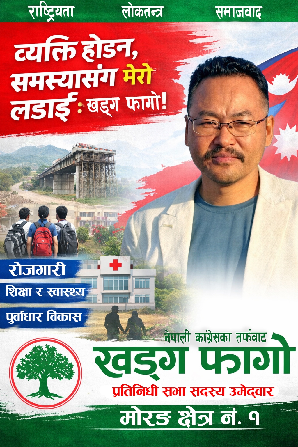 उर्लाबारी, २४ माघ । नेपाली कांग्रेस मोरङ–१ का प्रतिनिधिसभा उम्मेदवार खड्ग फागोले आफ्नो राजनीतिक प्रतिस्पर्धा कुनै व्यक्ति वा दलसँग नभई क्षेत्रले भोग्दै आएका समस्यासँग रहेको स्पष्ट पारेका छन्। उनले राजनीतिलाई सत्ता प्राप्तिको साधनभन्दा माथि उठेर जनजीवनसँग प्रत्यक्ष जोडिएको सेवा ..